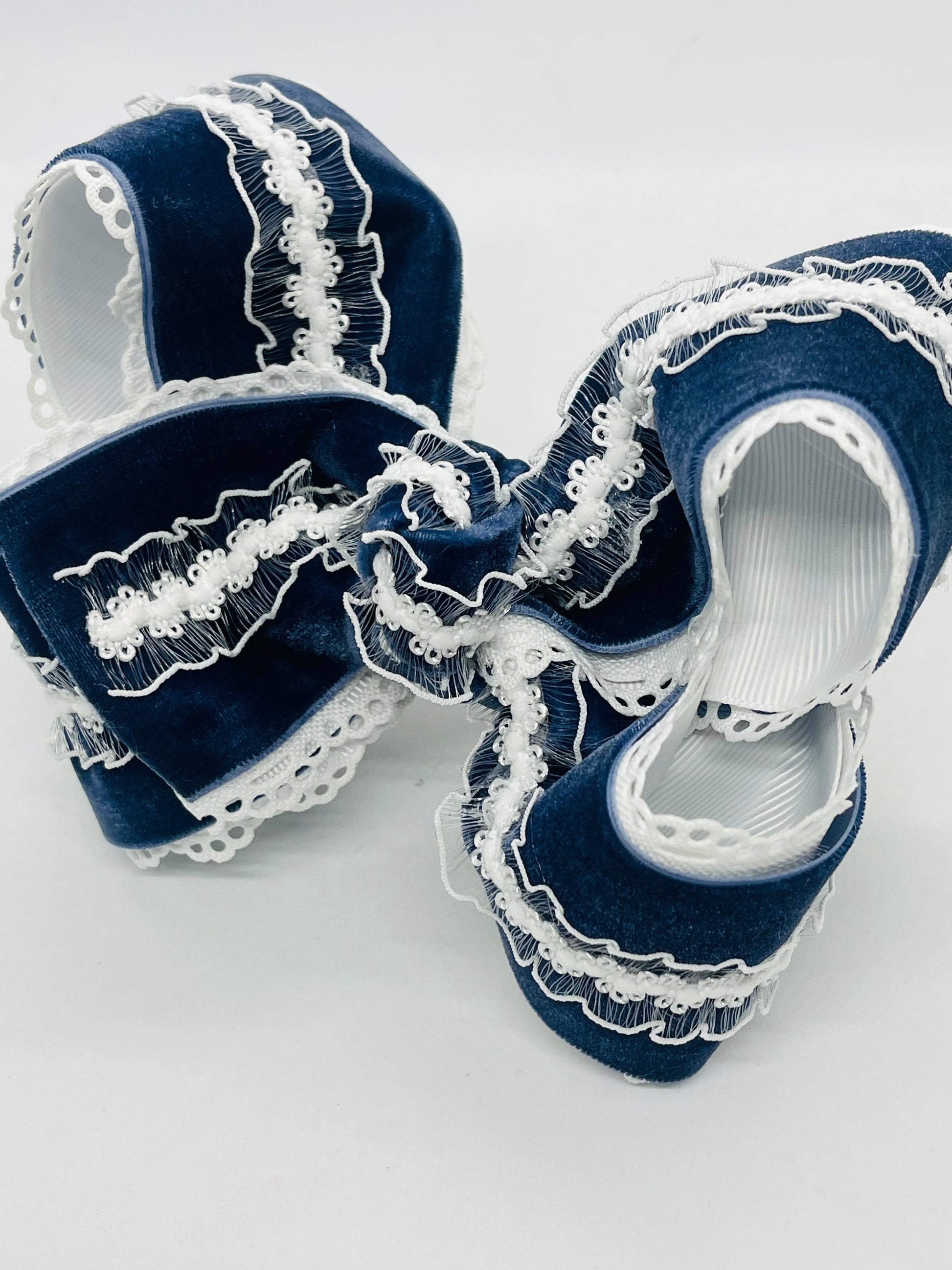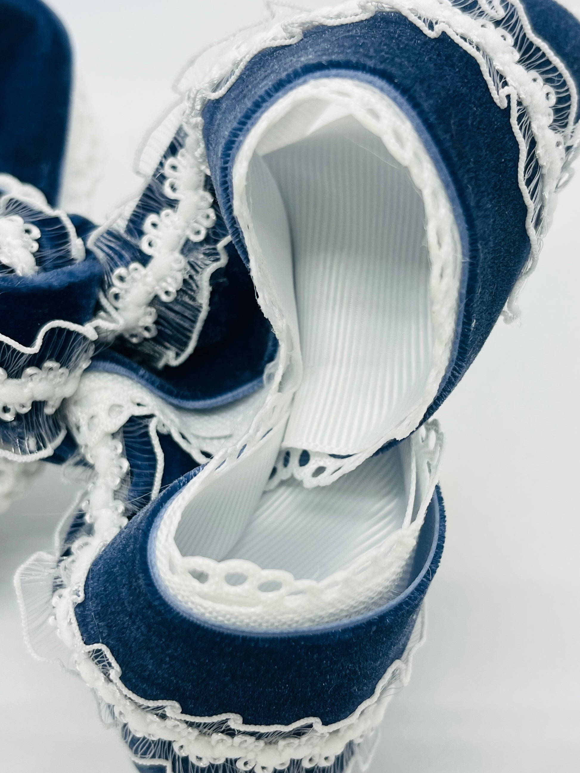 Triple layered with scalloped lace and blue velvet with added detailed lace.