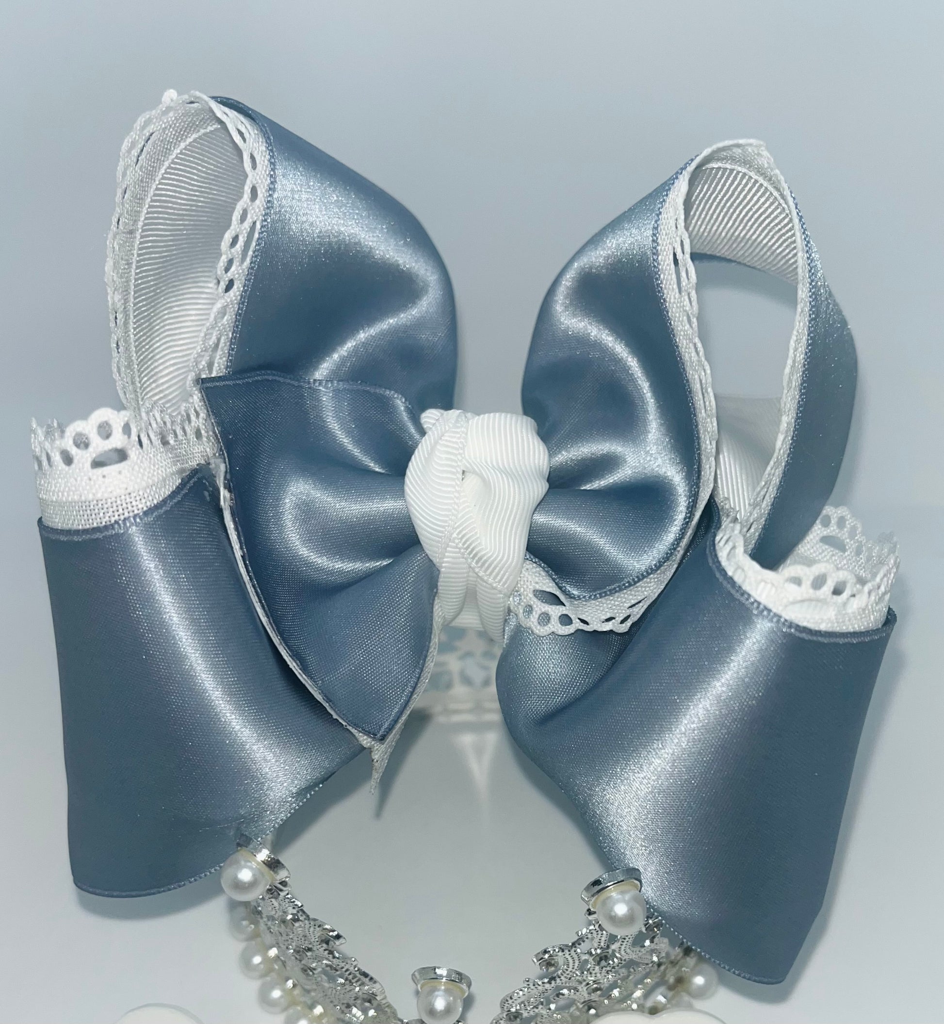 Triple layered dusty blue satin with added scalloped edge ribbon. Stiffened