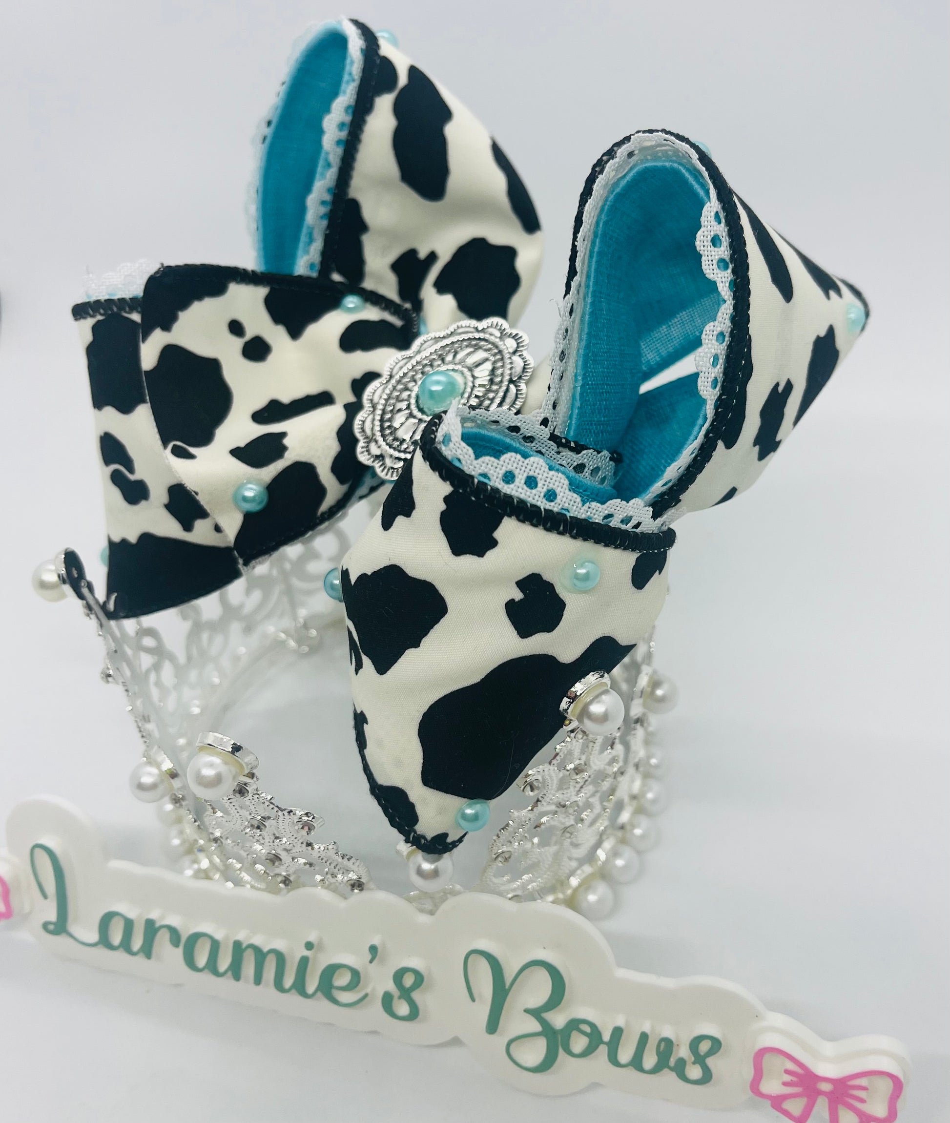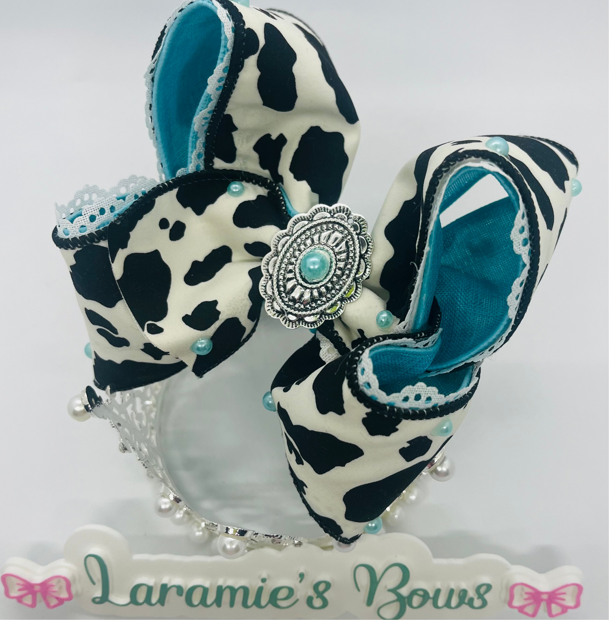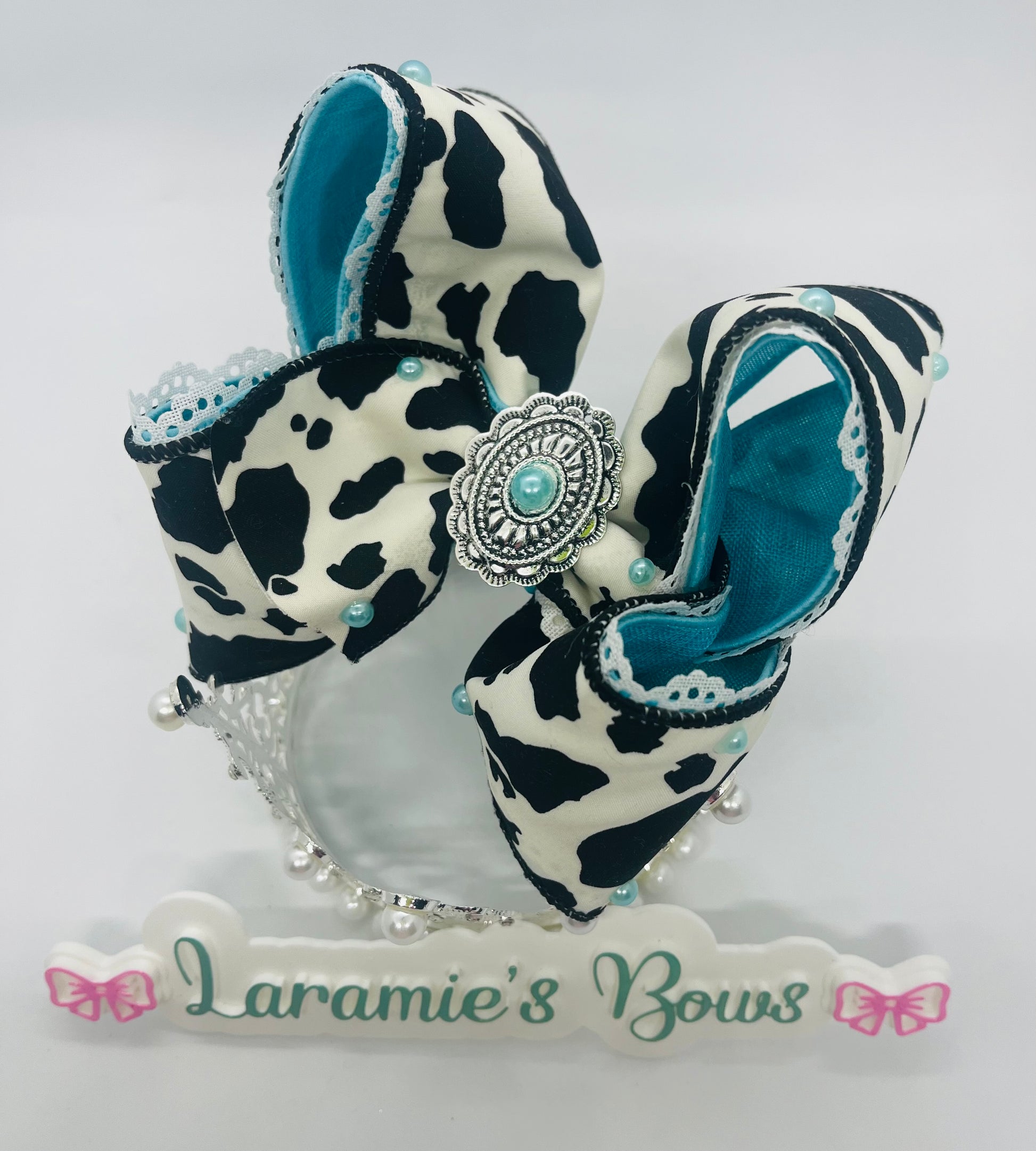 Triple layered , scalloped edge ribbon and cow print ribbon with added turquoise pearls & a center concho. This bow was named after and created by one of our wonderful reps.