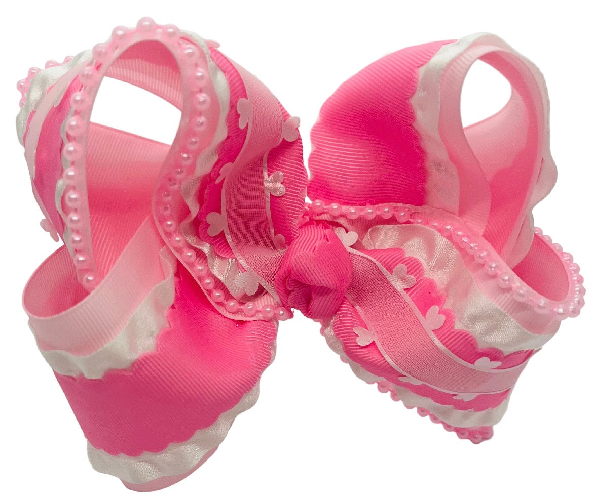 5 layered ribbon bow with added scalloped ribbon, sheer heart lace and a sting of pearls