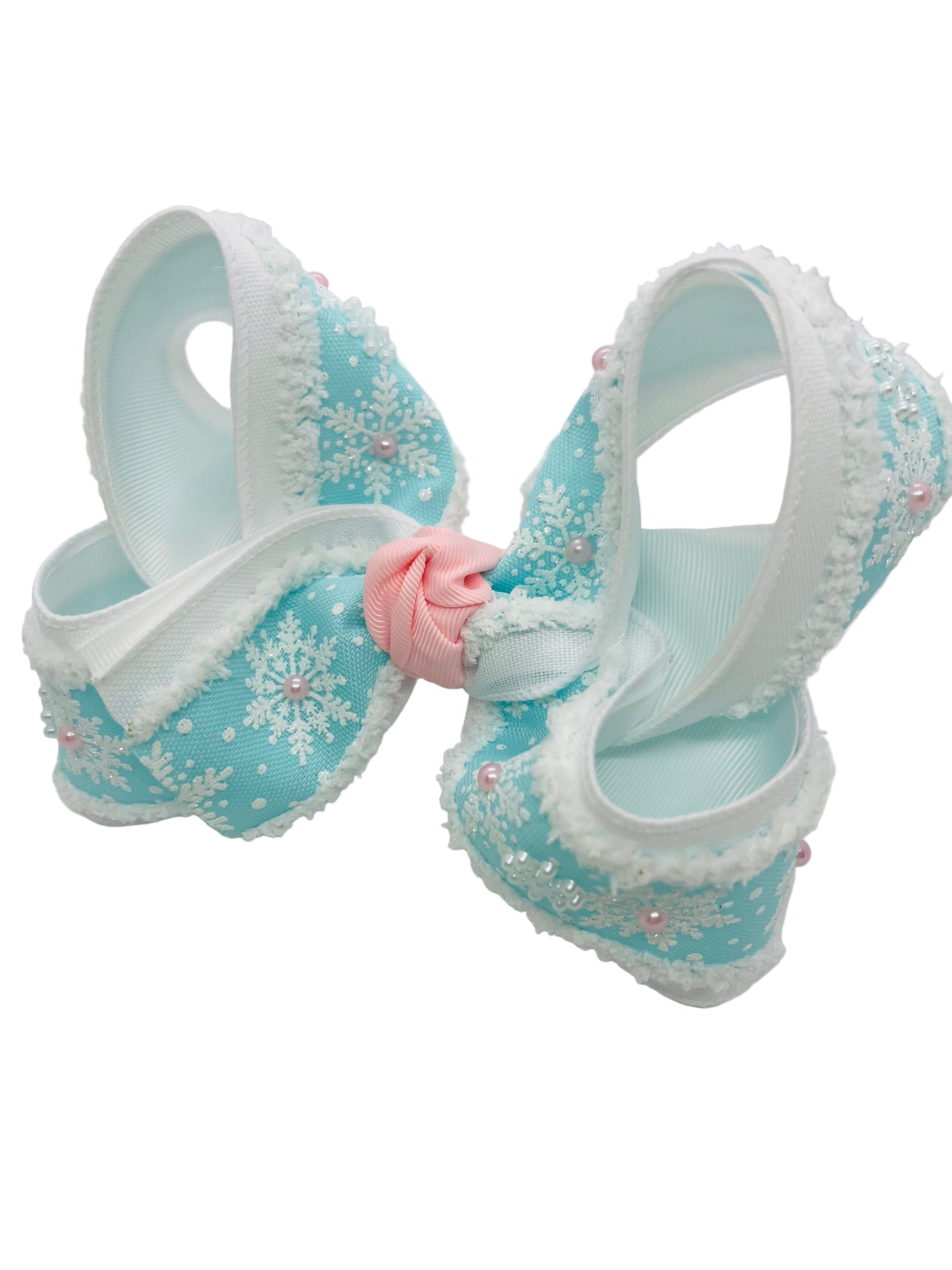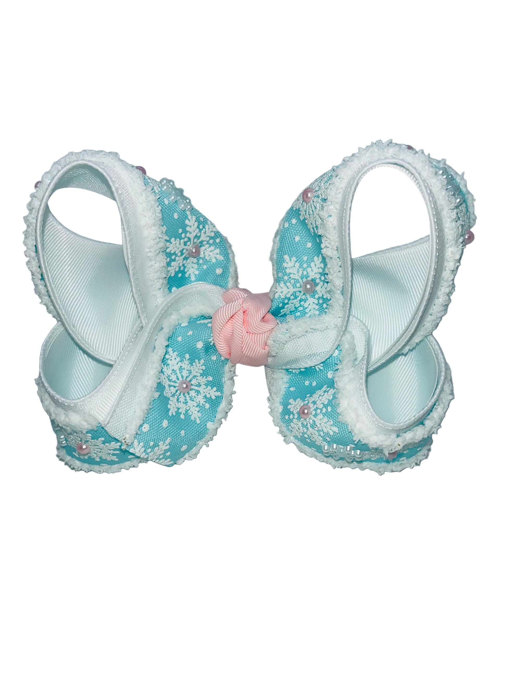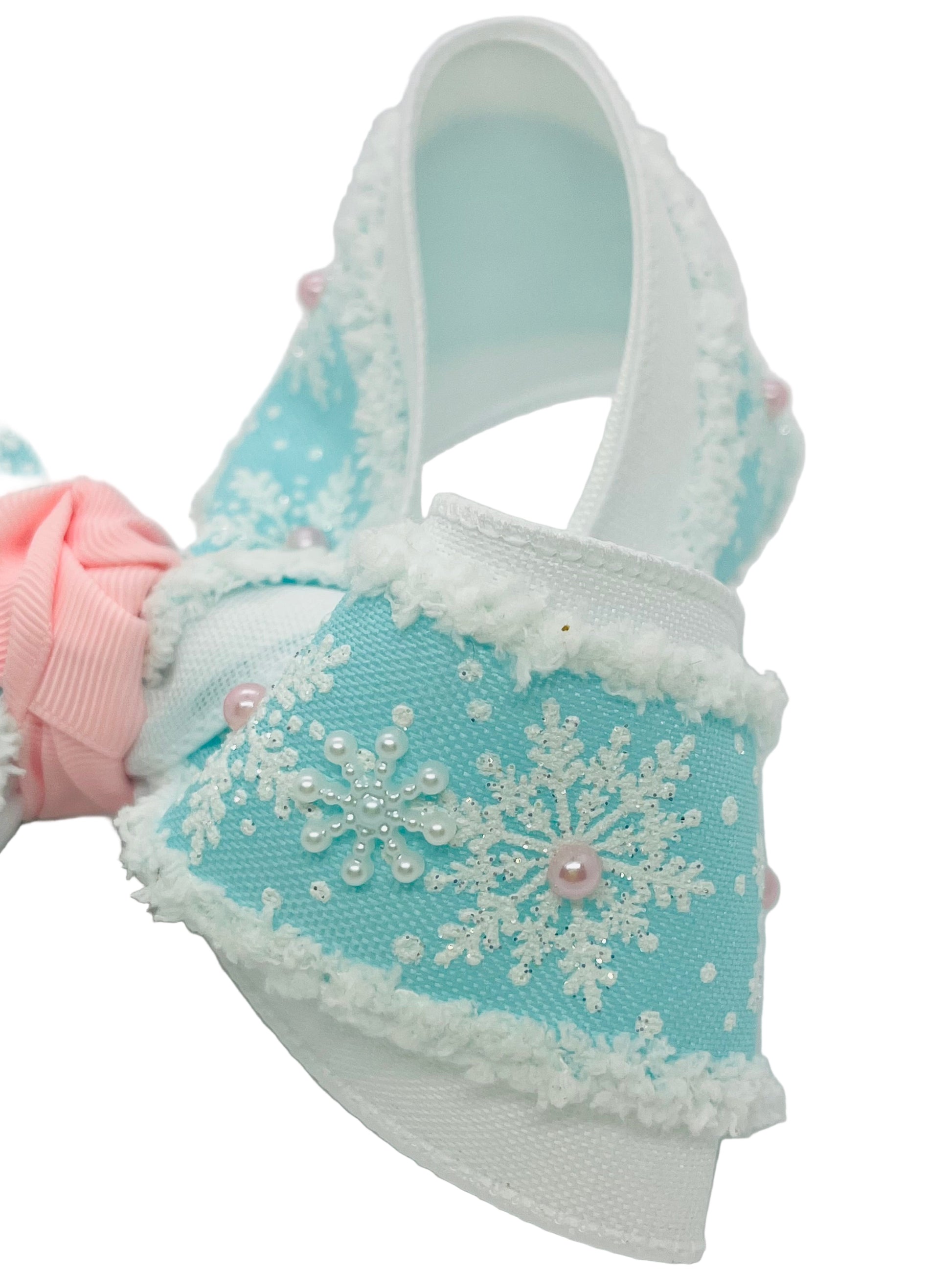 Triple layered snow drift snowflake ribbon with added pink pearls and white snowflake charms