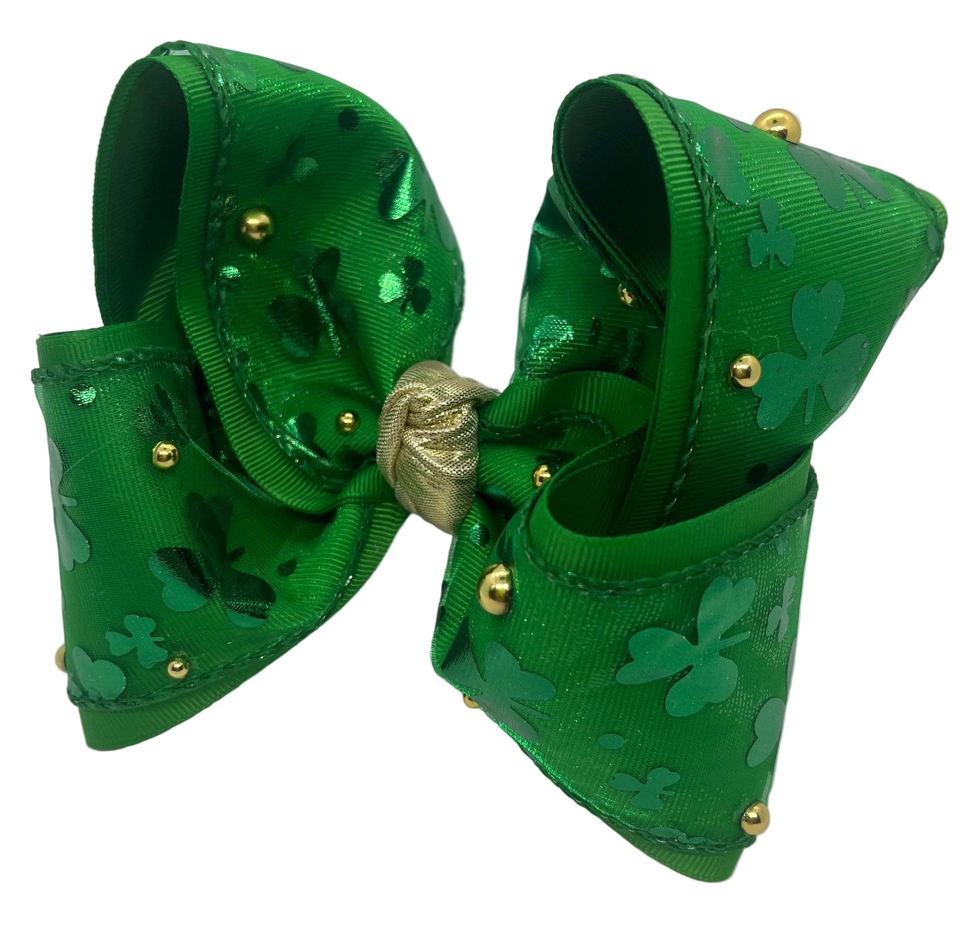 Triple layered with shamrock sheer shiny  ribbon and added gold pearls
