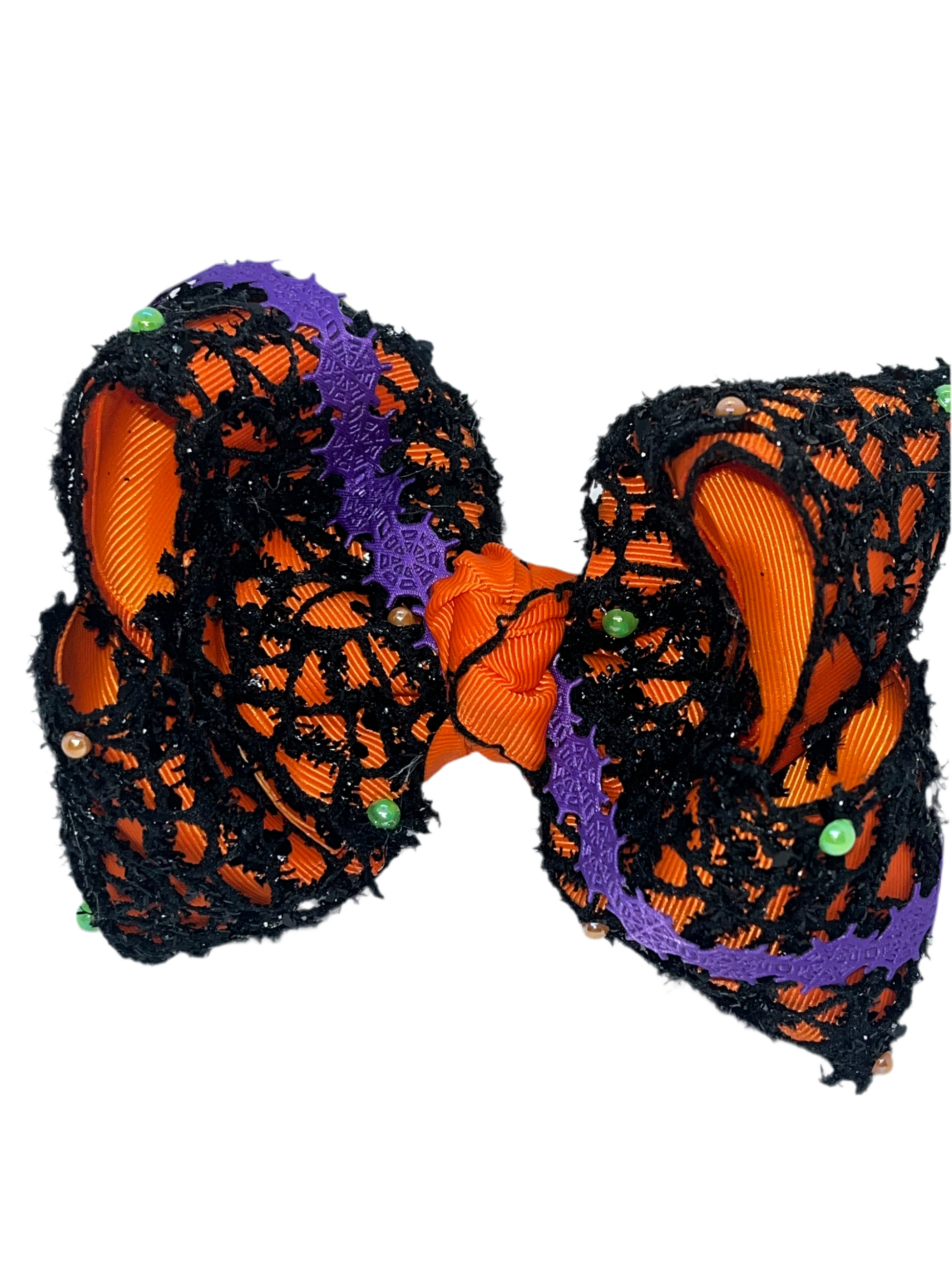 Triple layered with orange moon stitch and glitter web with added orange and lime green pearl’s & purple spider web trim. Stiffened